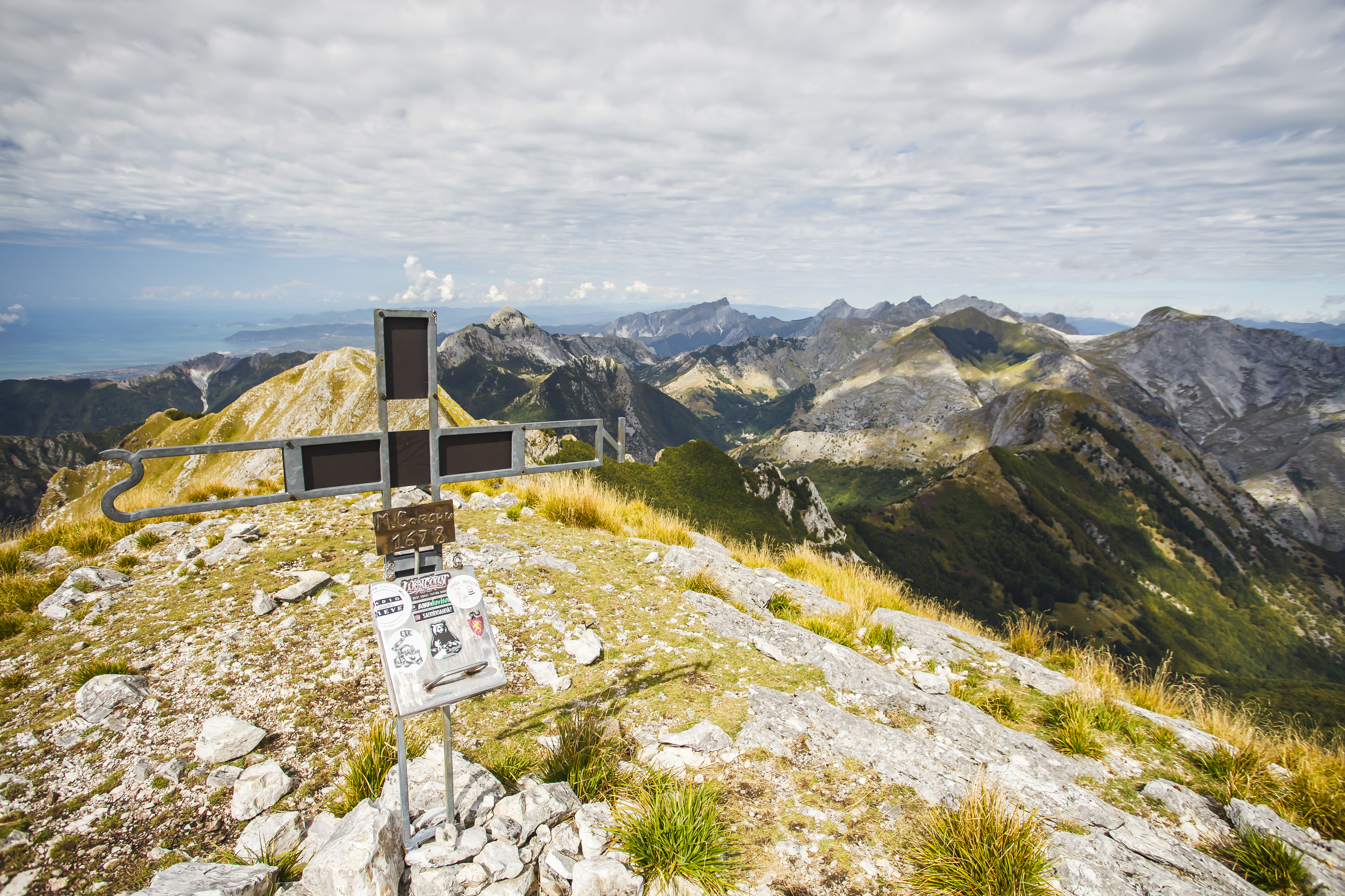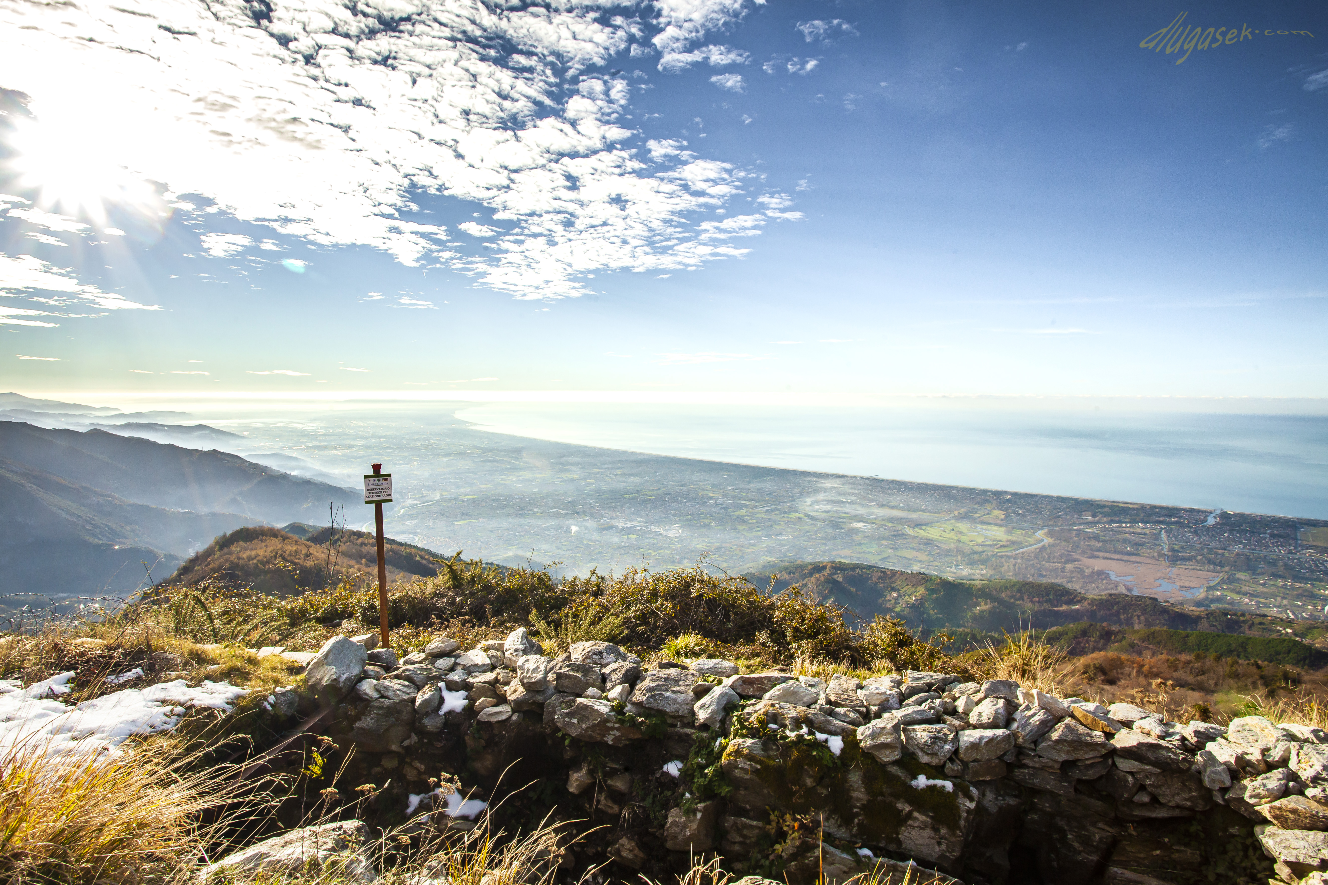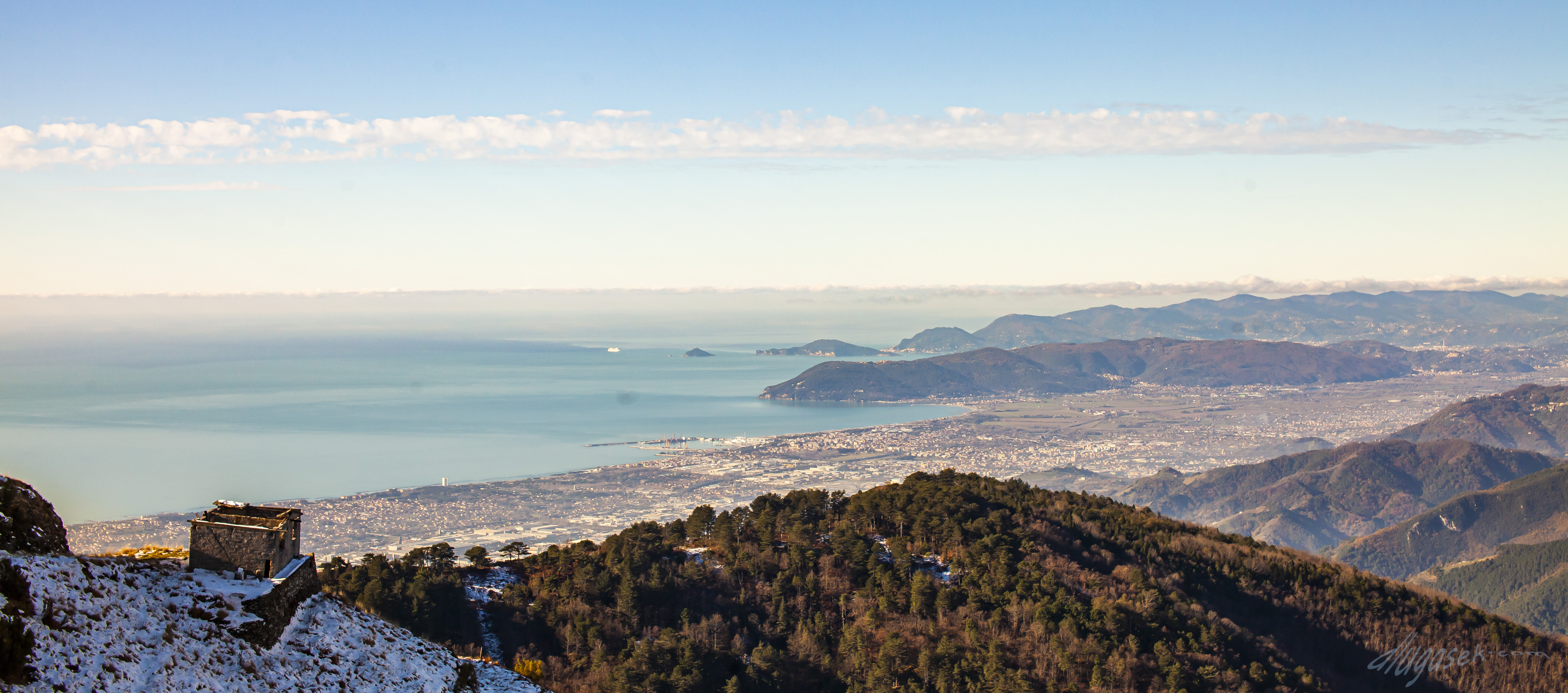 Direct translation, mountain with a hole. It is nice to live by the sea and close to the mountains. The views on a clear day are flabbergasting. On one of the pictures you can see Corsica and its highest peaks, between 200 and 220 km from Monte Forato. A story from a pal at work – one lad took his car somewhere up in Corsica, another guy in the Apuan Alps. They parked them just right and could actually have a conversation in morse language using the high beams. What a visibily!
