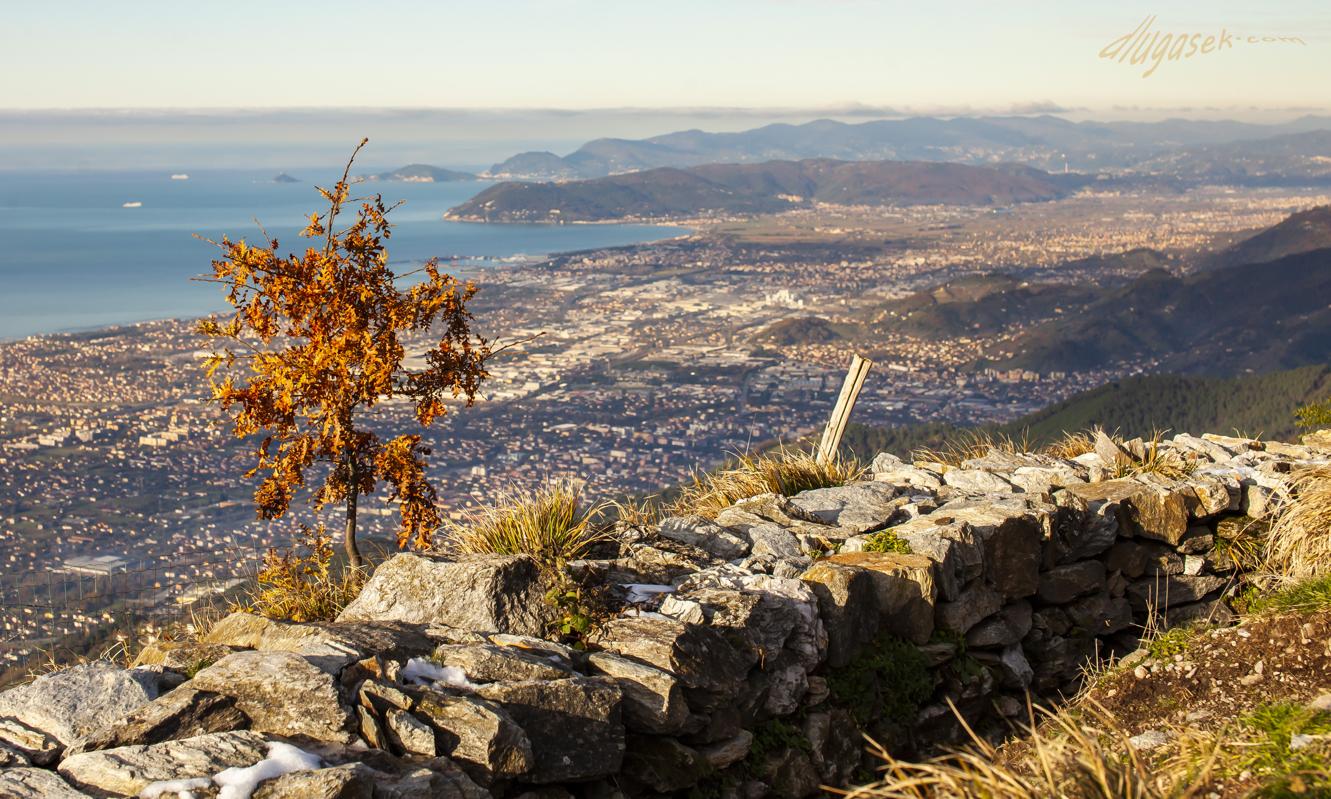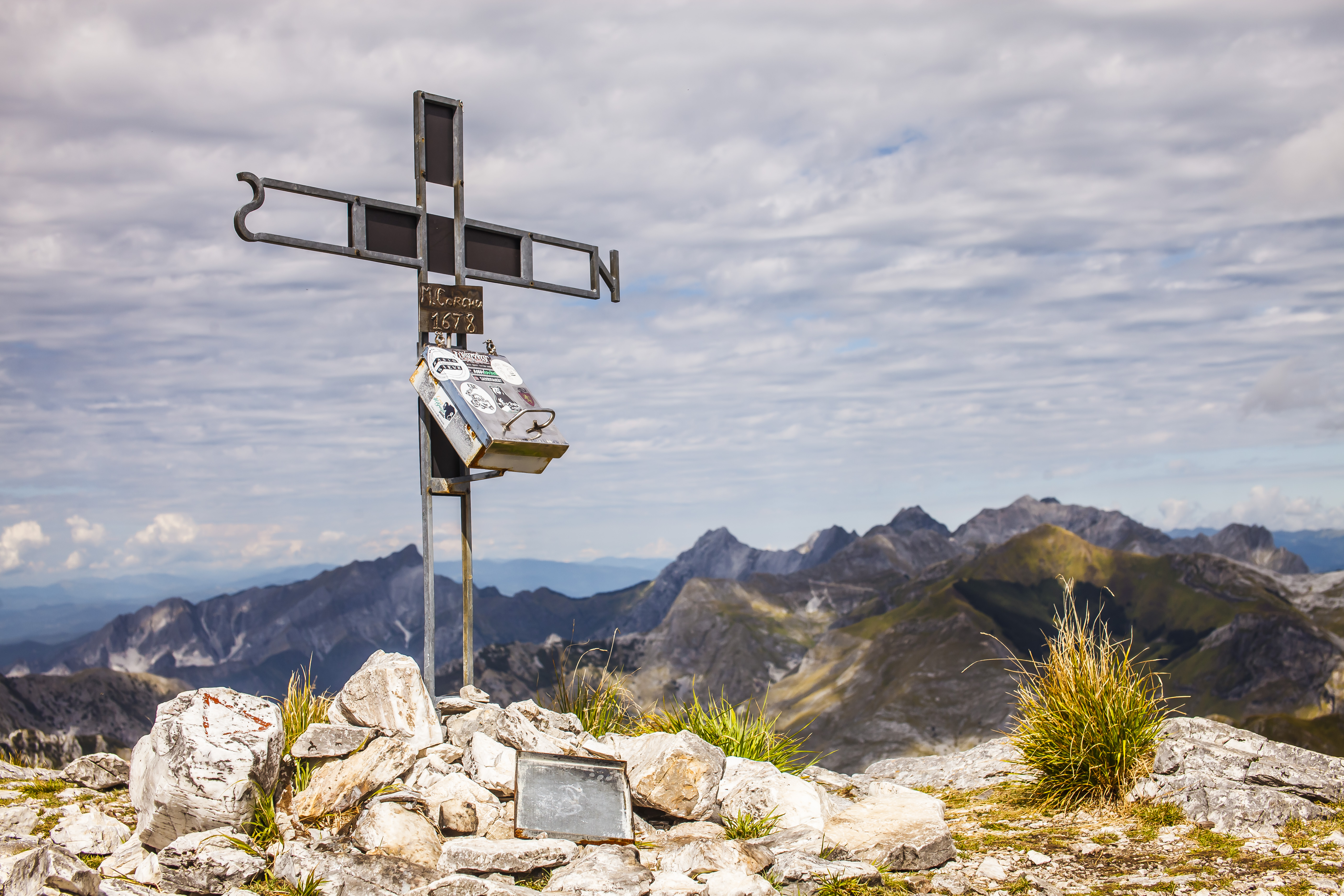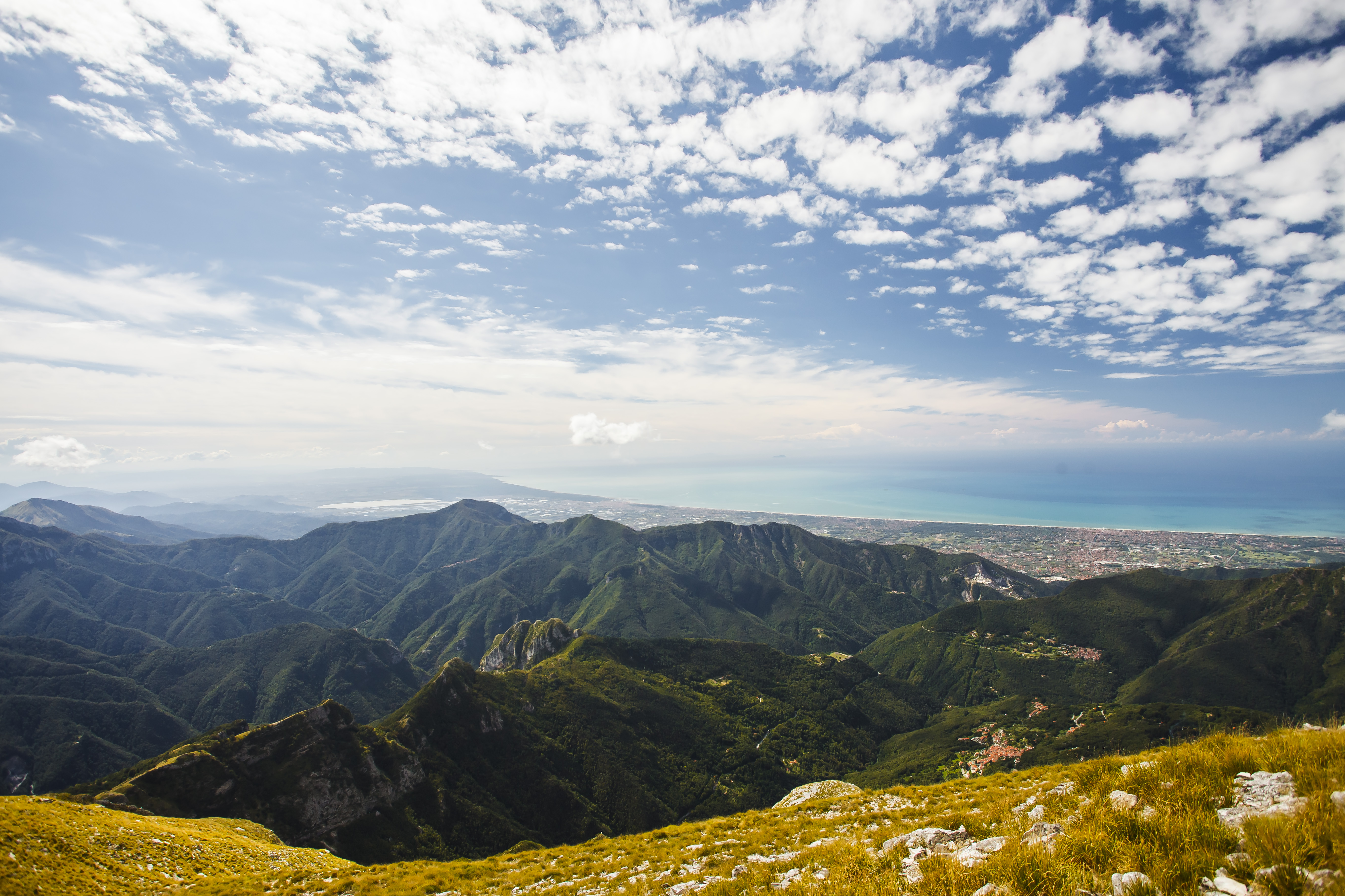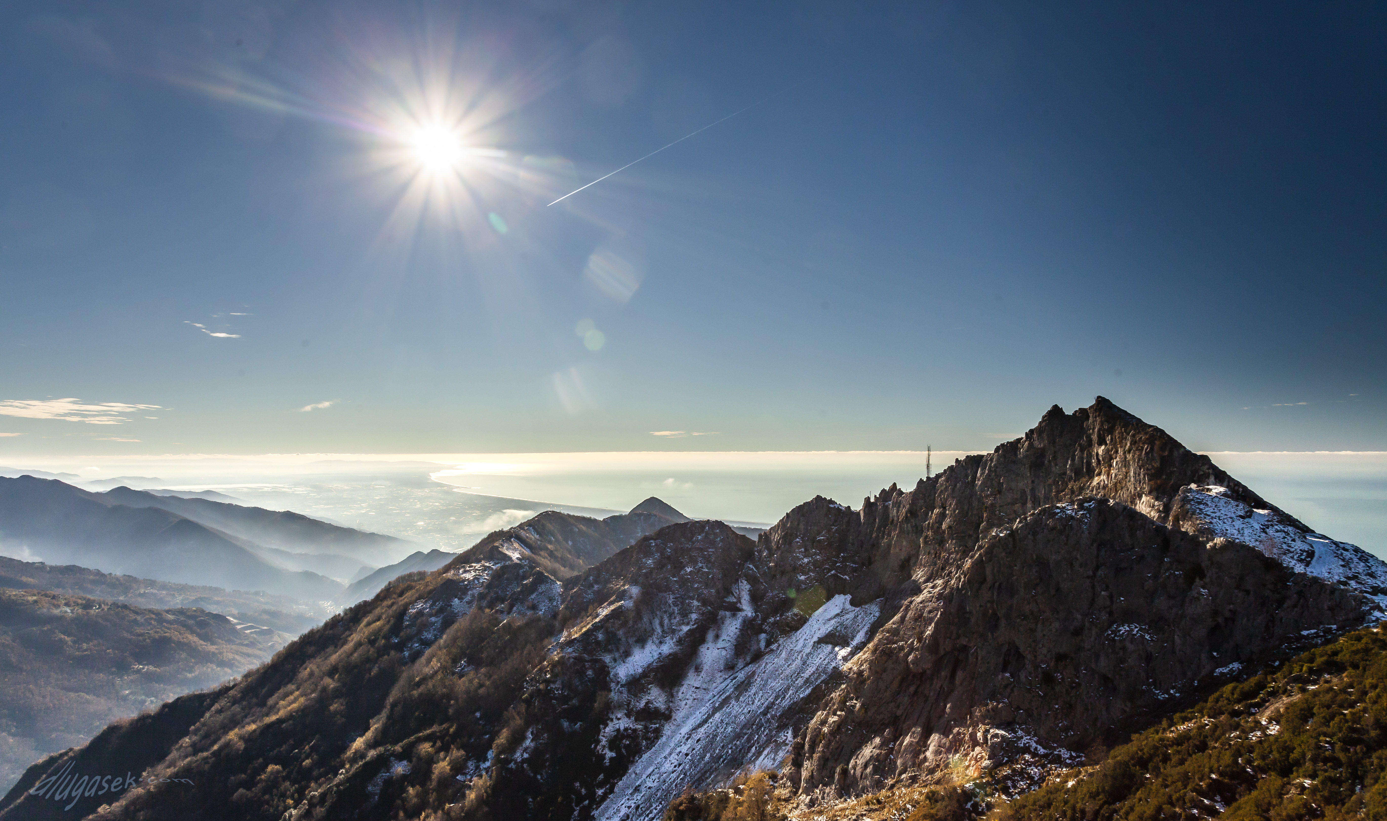 Direct translation, mountain with a hole. It is nice to live by the sea and close to the mountains. The views on a clear day are flabbergasting. On one of the pictures you can see Corsica and its highest peaks, between 200 and 220 km from Monte Forato. A story from a pal at work – one lad took his car somewhere up in Corsica, another guy in the Apuan Alps. They parked them just right and could actually have a conversation in morse language using the high beams. What a visibily!